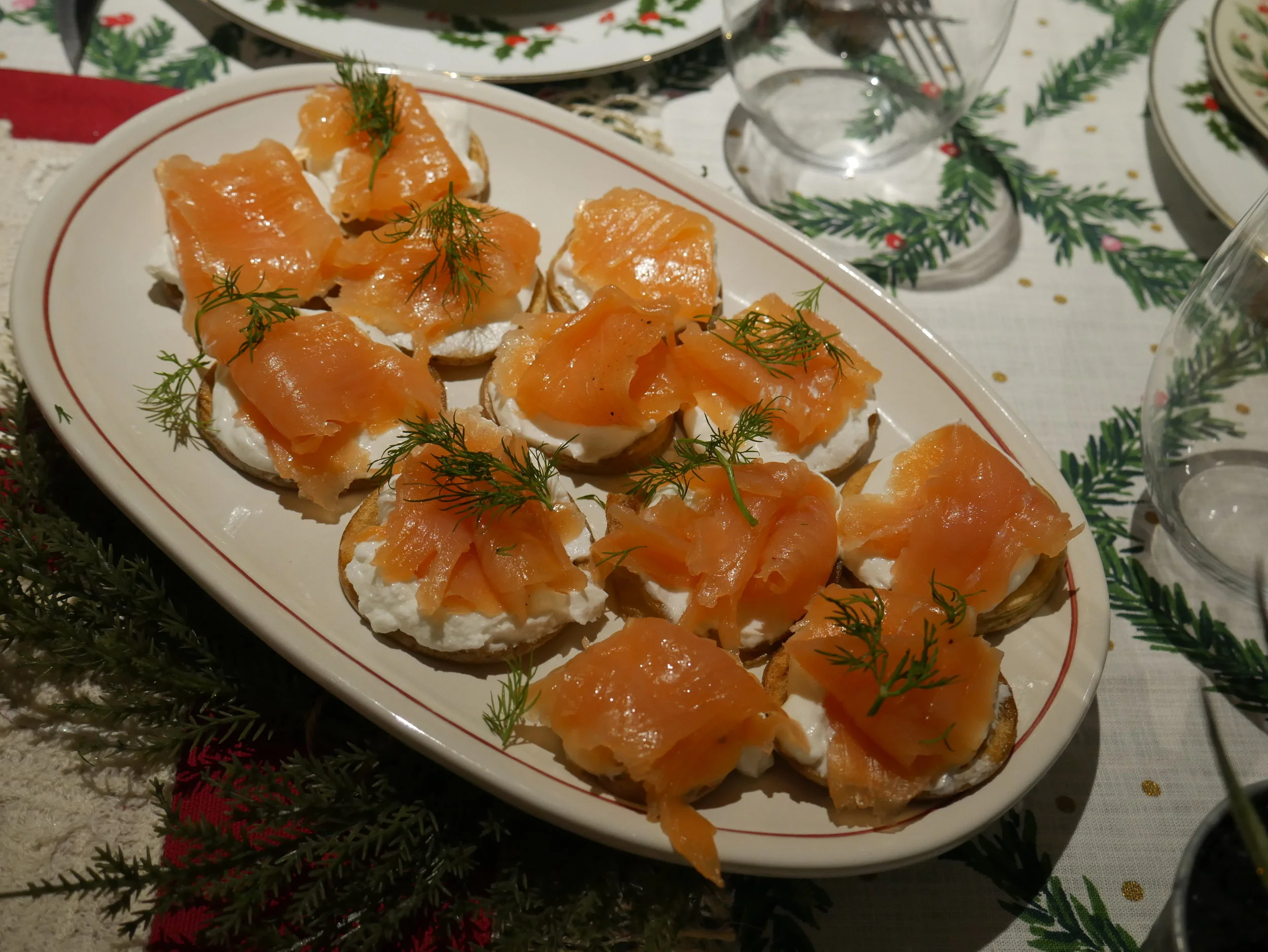 Along with the filet mignon and shrimp that became my main course, the smoked salmon at Fairway had also called out to me. It wasn’t bound for a board, but in the same spirit of sticking to simple delicious bites, I mounted it on top of crispy slices of Yukon Gold potato with Greek yogurt and dill. The little green dill fronds were right at home among my not-so-minimalist pine branch extravaganza!